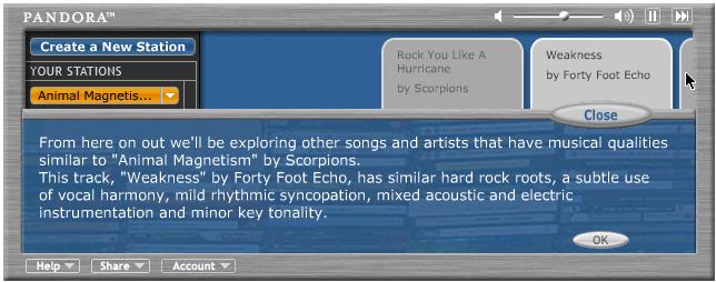 These screenshots tell the story. You set up your new "station" by naming a song you like. It plays something from the same group or album first, then goes off and tries to guess at songs you'll like. The screens let you add more songs to the list, rate songs it plays, and skip a few songs each hour.