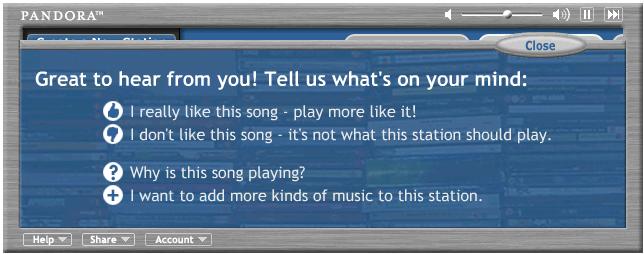 In less than a minute, Pandora creates a customized radio station for you. It does this by asking you to start with your favorite song. Using data from the "Music Genome Project" to find songs which are similar in a musical sense to what you like. You can skip songs you don't like, add more favorites on your own and rate the ones it chooses to help it refine and expand your radio station.