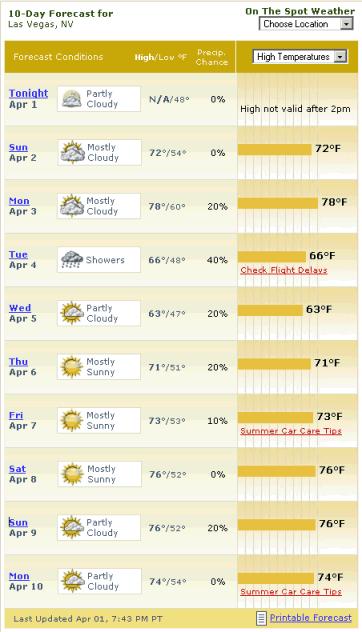 I plan to have a great, relaxing time out there. For me, its great that Advisors uses the Marriot way out on the edge of town away from the strip. Just regular stores, restaurants, and hotel rooms. The place is comfortable, quiet, and has a great pool. Not far up the street I can go out for a normal dinner and catch a film without ever having to deal with the strip. If I feel like going to see a show -- there is a Cirque I haven't seen yet -- its a short ride. Oh, and the weather this time?