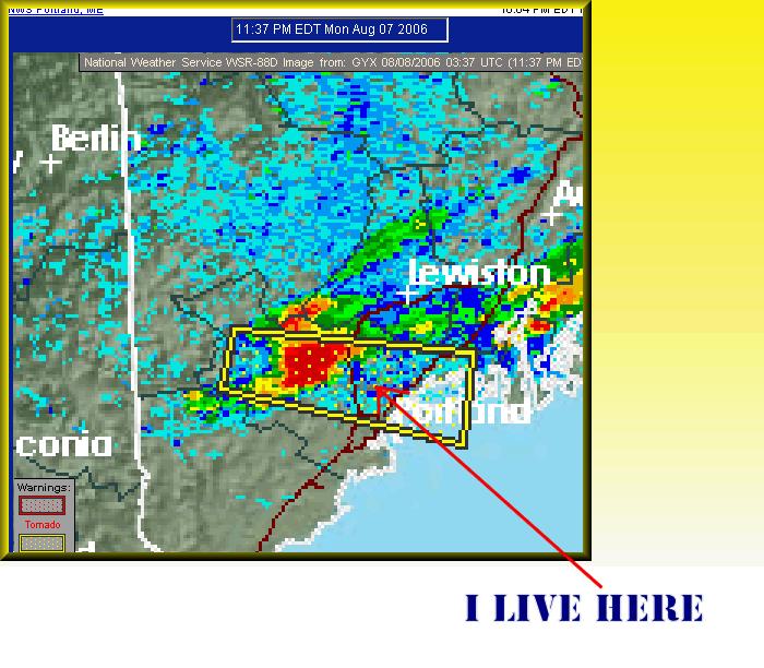 Its 23:56 and I'm waiting for the pager to go off (oh, just went once, but for the west side of town...) The large red blob in the yellow "Watch Box" is a fantastic electrical storm which is going to pass right through town. Gotta love the new "Weather.Gov" radar site....