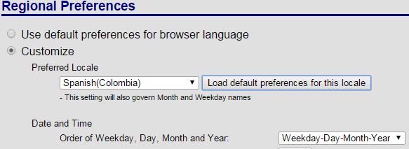 9. Select "Customize" and set your locale to "Spanish (Colombia)" then click "Load default preferences for this locale", and then save.