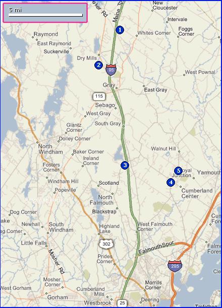 Nearly every fire crew in the state was busy yesterday and today looks to be the same. With the onset of spring we've got warm, dry weather and brisk winds but the ground cover hasn't yet gone through the "green up" process so things are tinder box dry. At 16:45 yesterday I heard the call go out on the radio for two nearly simultaneous fires. One of our crews was requested to help Portland and Falmouth deal with a brush fire off the "Falmouth Spur" of the Maine Turnpike that sounded like quite an event, while at the same time another crew was requested from our West station (3) to cover Gray's central station (2). Since half of our west station members were already busy dealing with the first fire, our Central station (4) crew of Engine 3 was sent to Gray instead. They called for additional manpower so I drove my own car from my home (5) up to Gray central station (2).